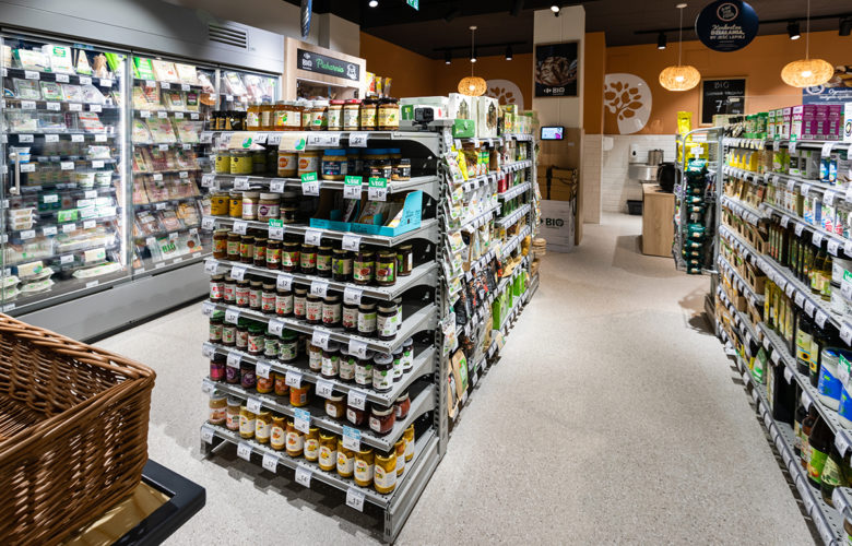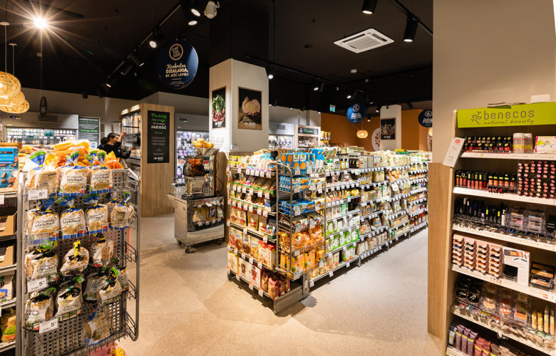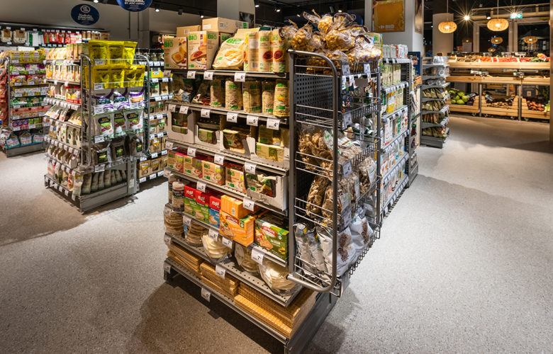 W nowej przestrzeni handlowej uwagę przykuwa nowoczesna wyspa warzywna z trzema poziomami ekspozycji towarów. Ażurowe półki i mobilne kosze, wyspy, których spody zostały wykonane z blachy perforowanej, zapewniają swobodny przepływ powietrza, co wpływa na utrzymanie dłuższej świeżości magazynowanych produktów. Kółka z hamulcem koszy pozwalają na sprawne ich towarowanie i sprzątanie. Do regału warzywnego zamontowana jest w profilach dostawka na produkty uzupełniające i akcesoria.